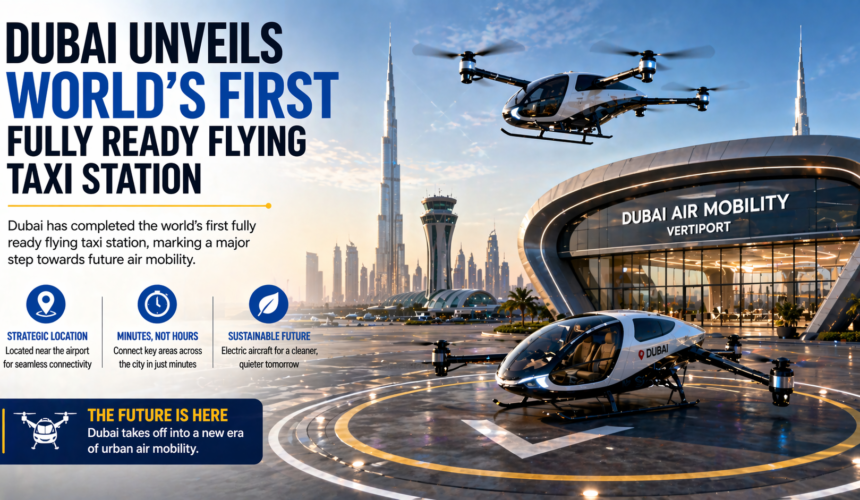Dubai has taken a decisive leap into the future of urban mobility with the completion of the world’s first fully ready flying taxi station. Located near Dubai International Airport, the newly developed vertiport is set to redefine how people move across the city cutting travel time between key destinations to just minutes. The milestone reinforces Dubai’s position as a global innovation hub, where infrastructure is increasingly being designed with next-generation transportation in mind. A New Era of Urban Air Mobility The vertiport has been purpose-built to support electric vertical take-off and landing (eVTOL) aircraft commonly known as flying taxis. Unlike traditional helicopters, these aircraft are quieter, more sustainable, and designed specifically for short-distance urban travel. With this infrastructure now in place, Dubai is preparing to integrate air taxis into its broader transport ecosystem, complementing roads, metros, and existing transit networks. Strategic Location, Faster Connectivity Positioned near one of the world’s…